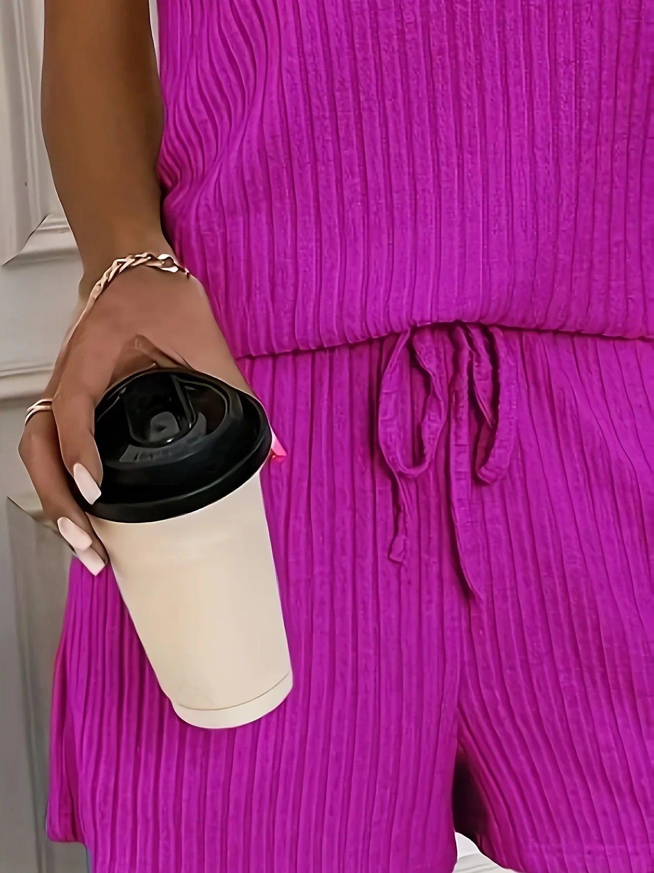 Soft Ribbed Texture for Ultimate Comfort: The Hristina two-piece set is made from a soft, ribbed fabric that feels gentle and breathable against the skin. It's perfect for warm weather, allowing air to circulate freely and keeping you cool. The lightweight texture enhances comfort without clinging.