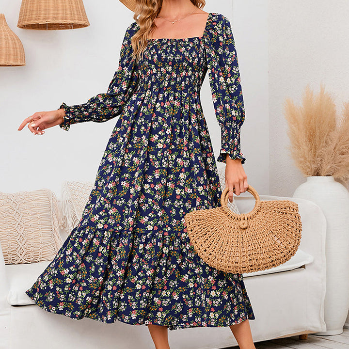 Vasilya - Elegant Dress With Flared Sleeves and Floral Pattern