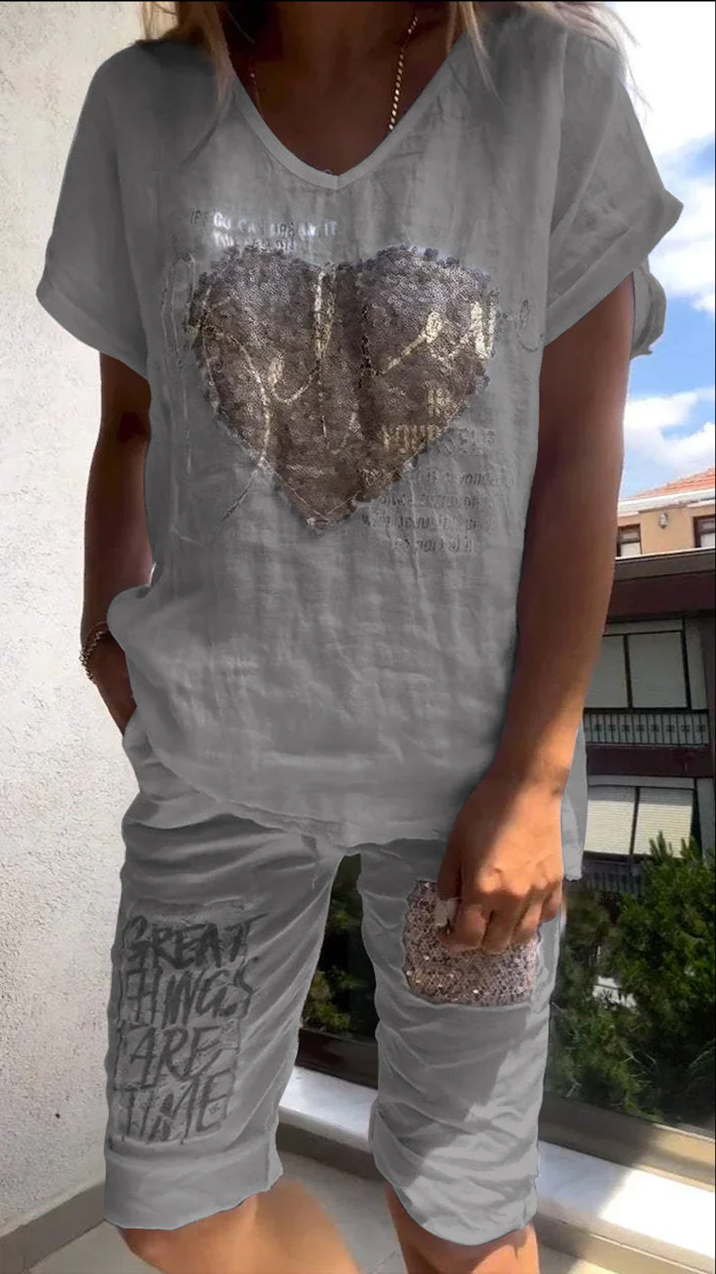 Varessa - Casual Two-Piece Suit with a V-Neck and Gold Embossing